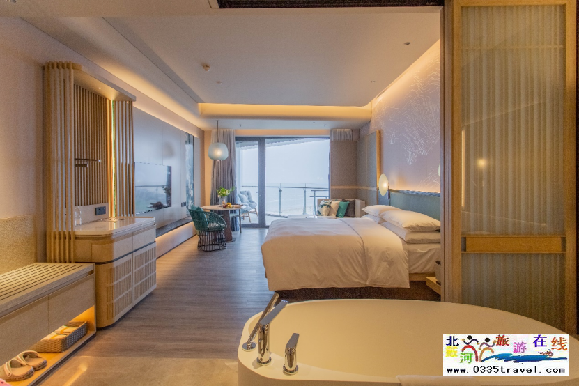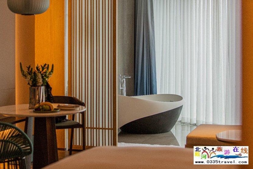 “海邊的生活,期待的是心靈的放松與沉淀,不適合過多的贅述?!笨头空w設(shè)計,細到床品、護膚品等都獨具巧思。戶戶望海全景浴缸、品牌特色床品、高速無線網(wǎng)絡(luò)、英國護膚品THISWORKS等一些列高檔設(shè)施和洗浴用品,為這場在蔚藍海岸的奢旅帶來極致純粹的享受。傍晚時分,斜陽余暉灑入室內(nèi),空間被鍍上一層黃暈,無一不透露華美而內(nèi)蘊深遠的生活追求。